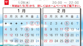 平素は当院をご利用いただき誠にありがとうございます。 令和8年1月、2月度の診療予定表を掲載いたします。 ご家庭で印刷して使えるPDF版はこちらからダウンロード