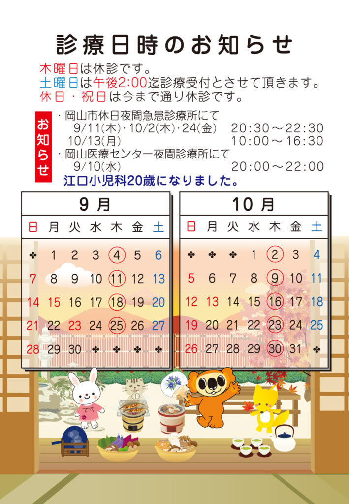 9月・10月度の診療予定表を掲載しました 今日のお話 2025.08.25 平素は当院をご利用いただき誠にありがとうございます。9月・10月度の診療予定表を掲載いたしました。ご家庭で印刷して利用できるPDF版はこちらから