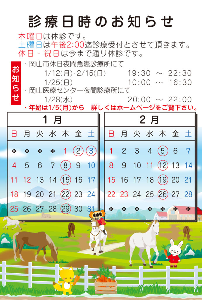 1月・2月度の診療予定表 今日のお話 2025.12.23 平素は当院をご利用いただき誠にありがとうございます。 令和8年1月、2月度の診療予定表を掲載いたします。 ご家庭で印刷して使えるPDF版はこちらからダウンロード